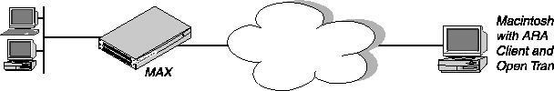 Figure 3-5 shows a Macintosh with an internal modem dialing into the MAX. The Macintosh uses the ARA Client software to communicate with an IP host on the Ethernet.